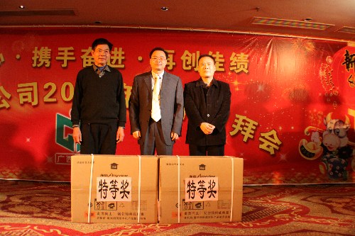 春節(jié)團(tuán)拜會(huì)上公司董事長(zhǎng)黃鼎龍(中)給抽中特等獎(jiǎng)的員工發(fā)獎(jiǎng)并合影留念